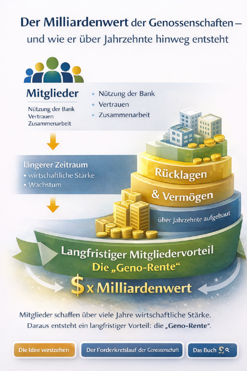 An diesem Punkt setzt der Gedanke der Geno-Rente an. Er richtet den Blick auf den langfristigen wirtschaftlichen Wert, der durch die gemeinsame Tätigkeit der Mitglieder entstehen kann.