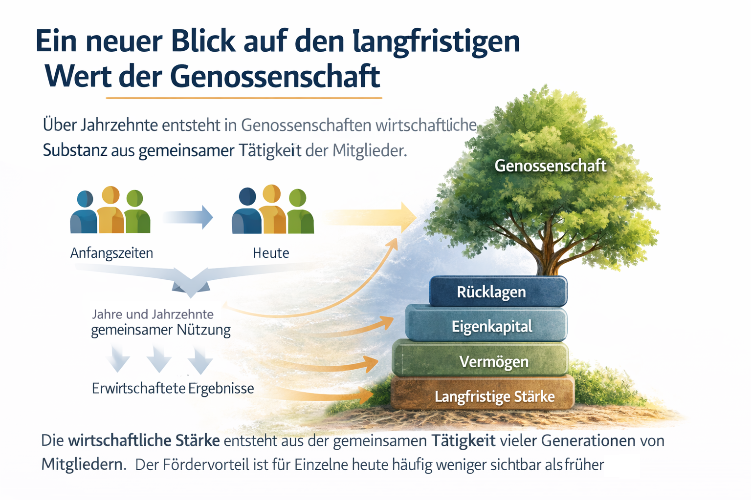 Diese indirekte Förderung kann jedoch für Mitglieder schwer erkennbar sein. Das führt zu einem gewissen Spannungsverhältnis zwischen dem formalen Förderauftrag und der subjektiven Wahrnehmung der Mitglieder. Die Genossenschaft bleibt zwar stabil, aber der individuelle Fördervorteil tritt weniger sichtbar hervor.