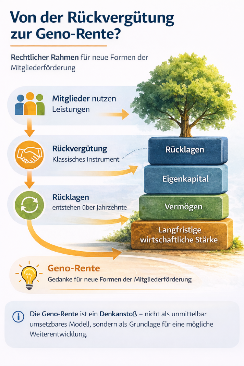 Die Idee der Geno-Rente versteht sich deshalb nicht als unmittelbar umsetzbares Modell, sondern zunächst als Denkanstoß für eine mögliche Weiterentwicklung des genossenschaftlichen Rahmens.